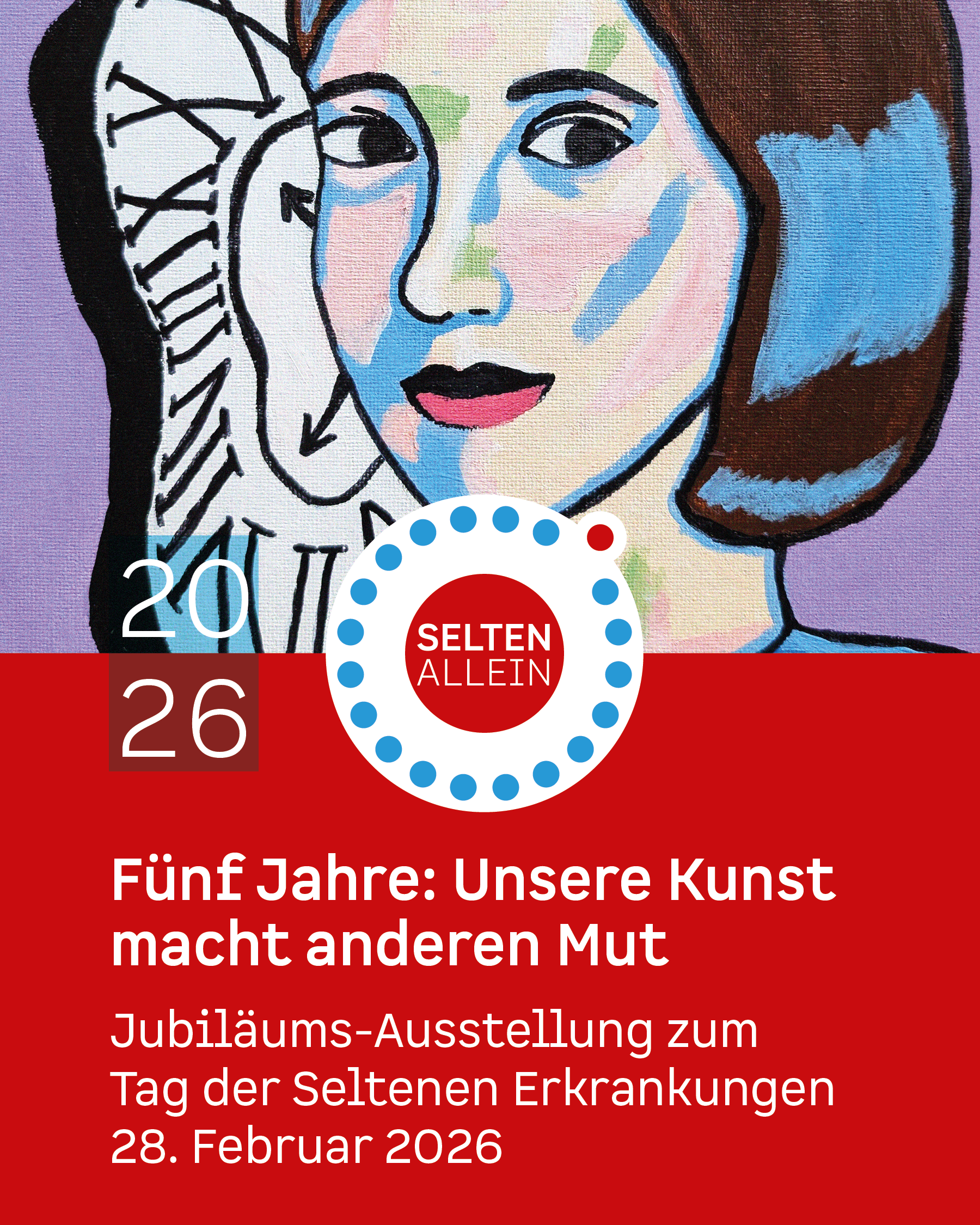 2026 feiert die Ausstellung „Selten allein“ ihr fünfjähriges Jubiläum. Unter dem Motto „Mach mit deiner Kunst anderen Mut“ fertigen seit 2022 Menschen, die von einer Seltenen Erkrankung betroffen sind, Selbstportraits an. Die Online-Galerie auf www.seltenallein.de ist seitdem auf über 100 Bilder angewachsen und die Ausstellung gern gesehener Gast auf Einkaufsbahnhöfen, in Kliniken und anderen öffentlichen Orten bundesweit.